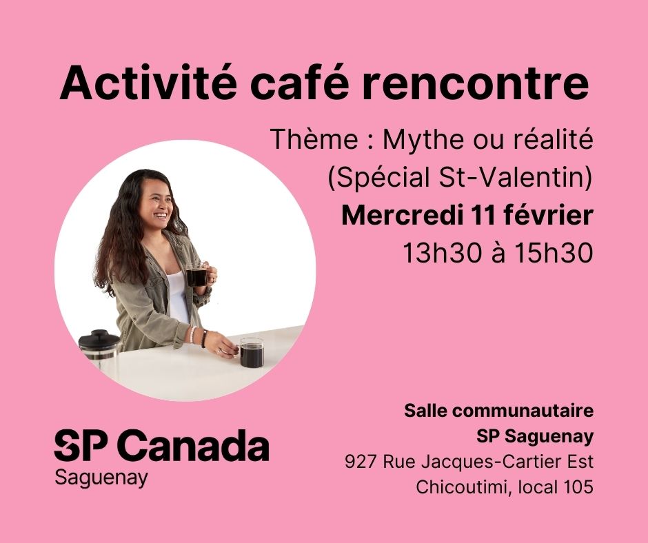 Activité café rencontre le mercredi 11 février de 13h30 à 15h30, sous le thème Mythe ou réalité spécial St-Valentin, à notre salle communautaire. (927 rue Jacques-Cartier Est, Chicoutimi, local 105)