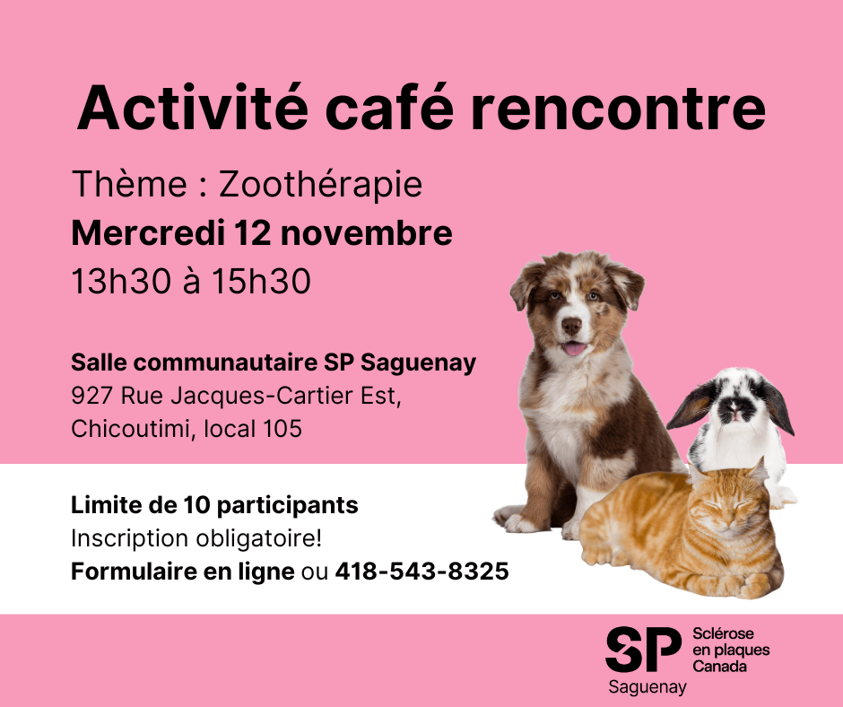 Activité café rencontre le mercredi 12 novembre de 13h30 à 15h30, sous le thème Zoothérapie, à notre salle communautaire. (927 rue Jacques-Cartier Est, Chicoutimi, local 105)