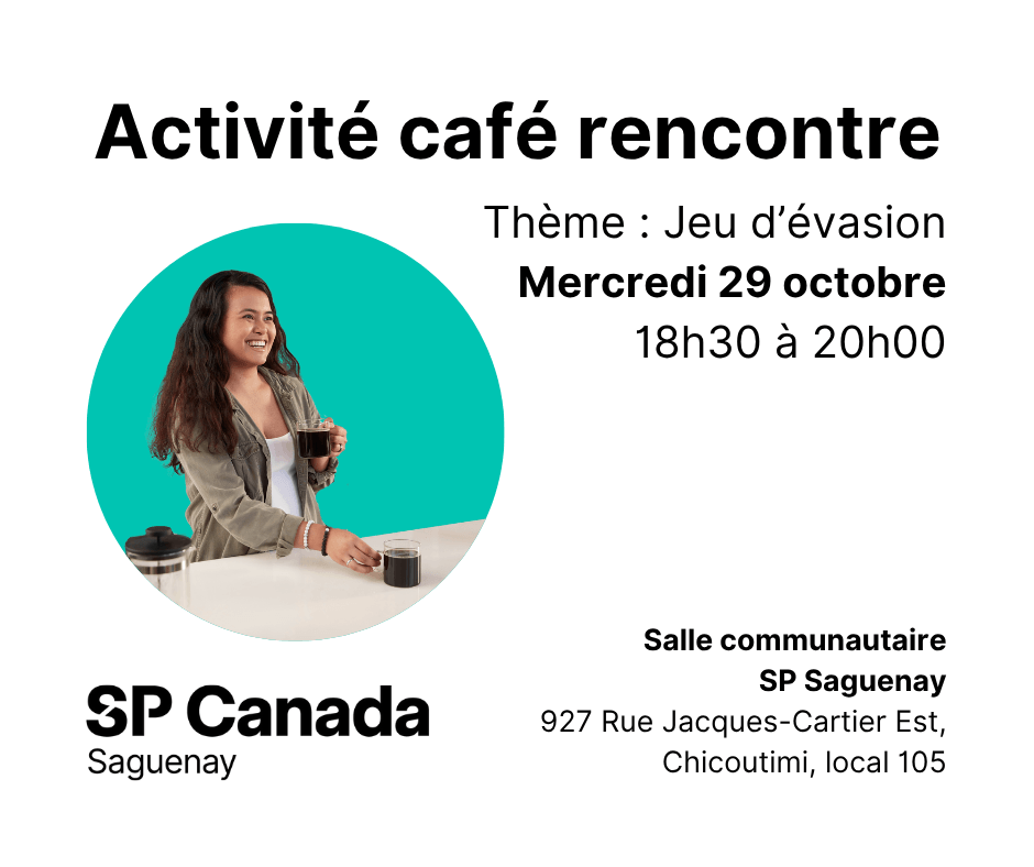 Surmonterez-vous le défi? 🔑 Activité café rencontre le mercredi 29 octobre de 18h30 à 20h00, sous le thème Jeu d’évasion, à notre salle communautaire. (927 rue Jacques-Cartier Est, Chicoutimi, local 105)