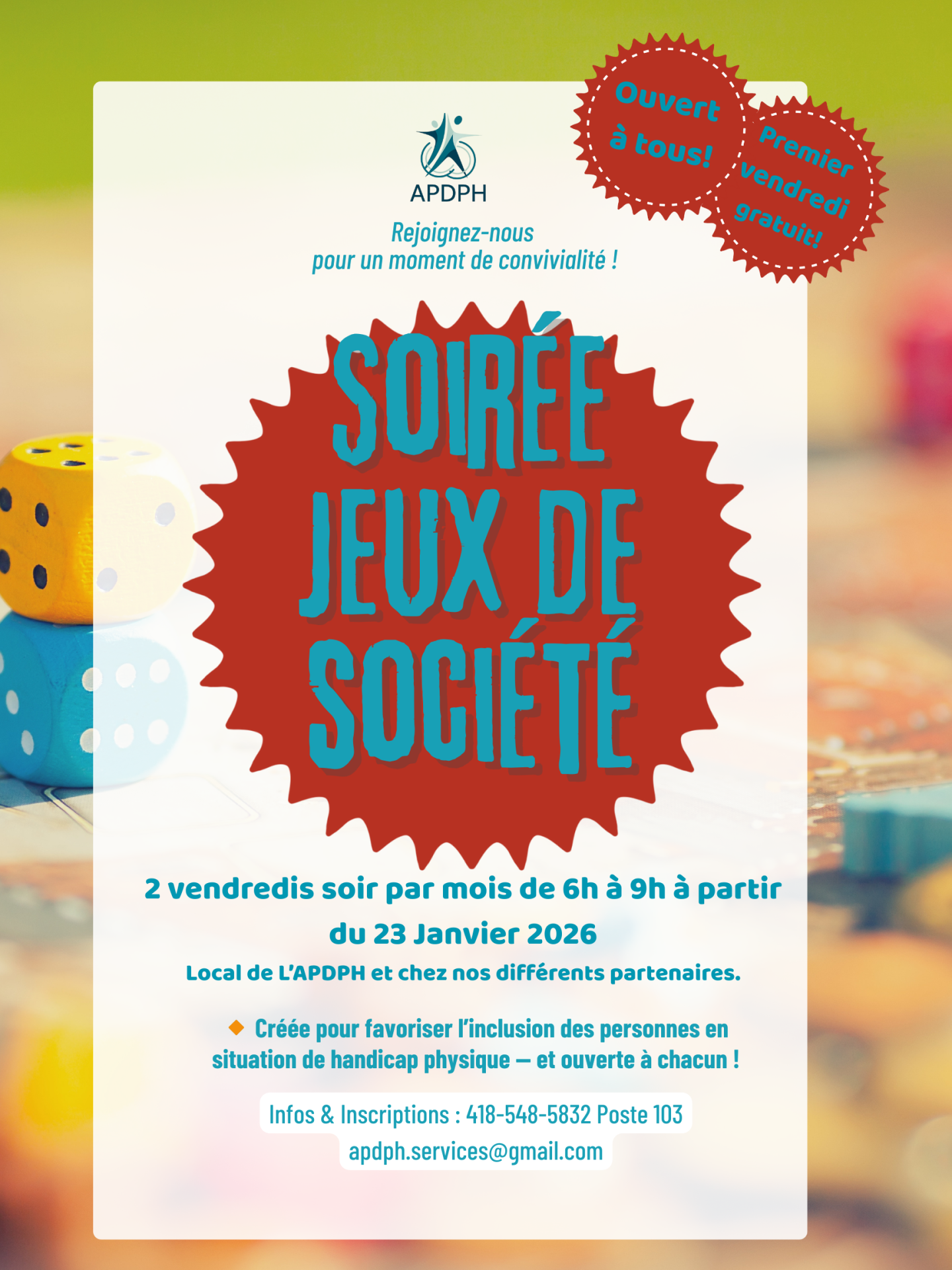 Organisées un vendredi sur deux, ces soirées conviviales ont pour objectif d’offrir un espace de rencontre accessible et chaleureux, où le plaisir du jeu devient un véritable moteur de socialisation. Les premières rencontres se tiendront dans les locaux de l’APDPH (2435 rue St Jean Baptiste à Jonquière), avec la possibilité, à moyen terme, de déplacer l’activité dans des organismes partenaires ou des cafés adaptés et accessibles aux personnes à mobilité réduite.