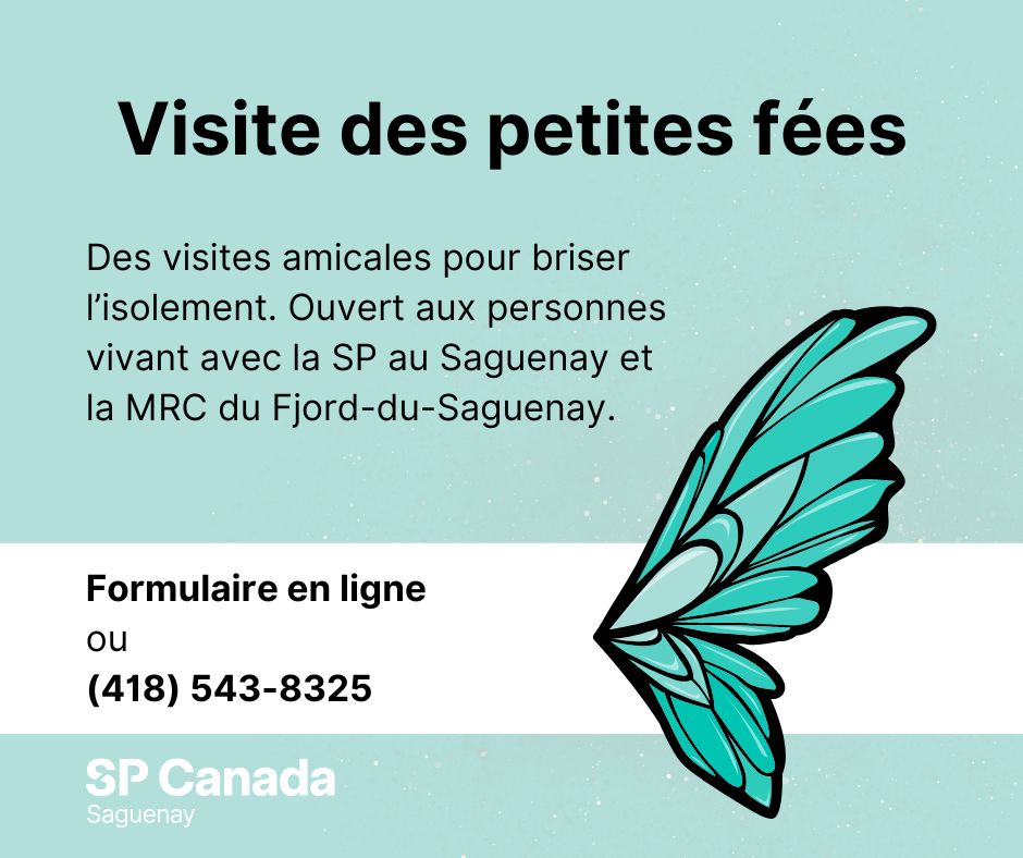 Le service Visite des petites fées est une initiative de bénévoles de notre organisme visant à briser l’isolement vécu par plusieurs personnes touchées par la sclérose en plaques. Nos « petites fées » offrent des visites sociales chaleureuses d’une durée d’environ 30 minutes à 1 heure, simplement pour échanger, écouter et partager un moment humain et bienveillant.